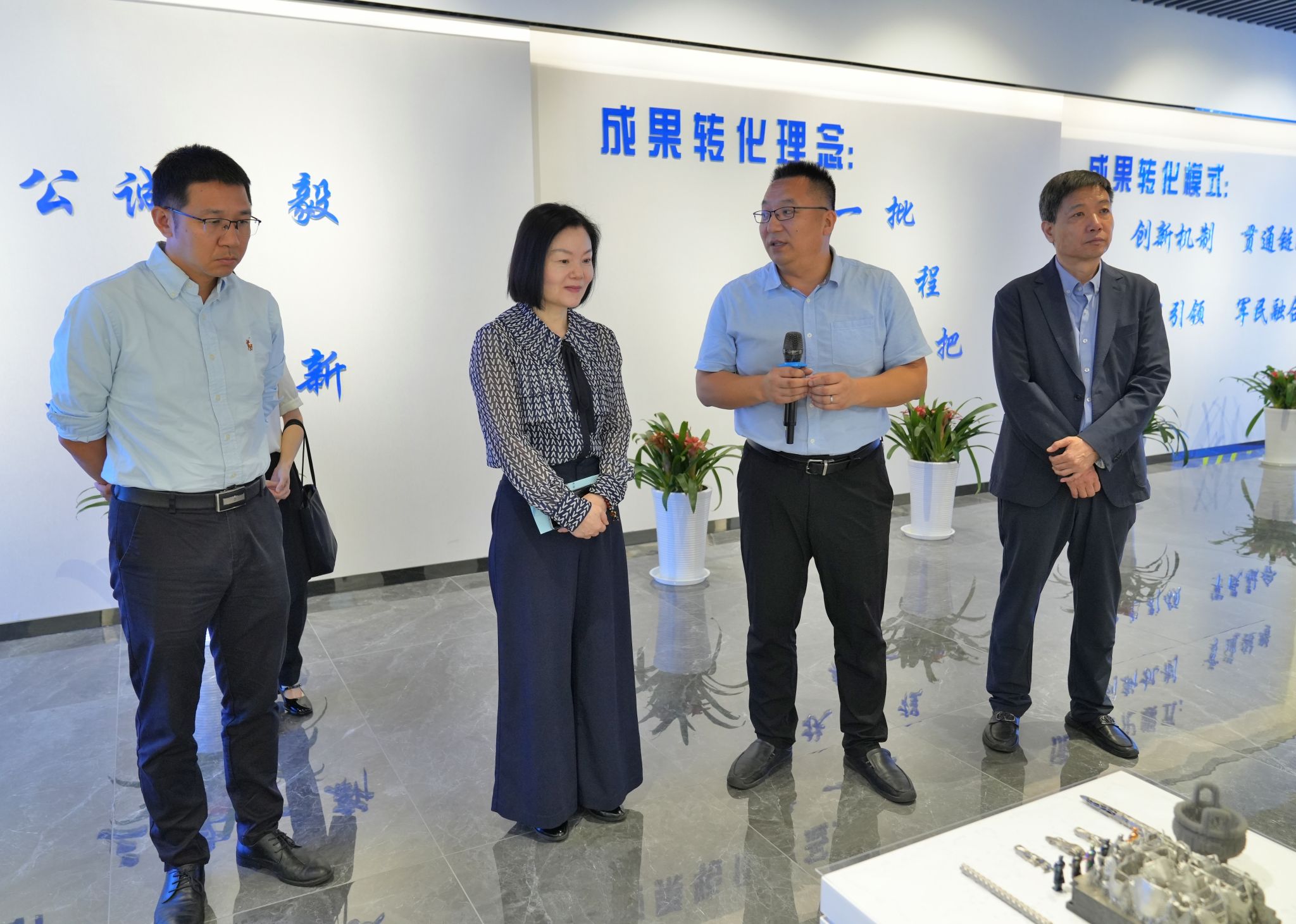 随后,管连秀一行在张建新的陪同下参观了学校科技成果转化展厅,详细了解学校科技成果转化企业的发展情况以及在面向国家重大战略需求、提升国防科技现代化水平、促进地方经济建设高质量发展和创新创业人才培养方面所做出的贡献。