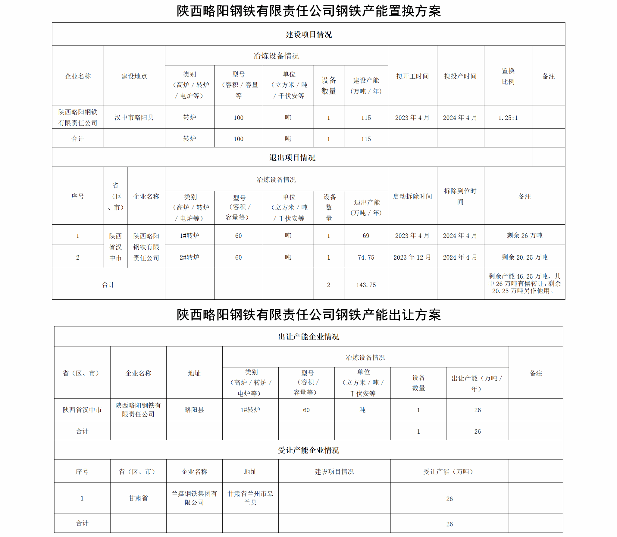 按照《国务院关于化解产能严重过剩矛盾的指导意见》和《国务院关于钢铁行业化解过剩产能实现脱困发展的意见》和《钢铁行业产能置换实施办法》要求,现将陕西略阳钢铁有限责任公司钢铁产能置换方案和钢铁产能出让方案予以公示,欢迎社会公众进行监督。公示期为2023年1月19日至2月20日,如有异议,请于公示期内以书面形式向我厅原材料工业处反馈。