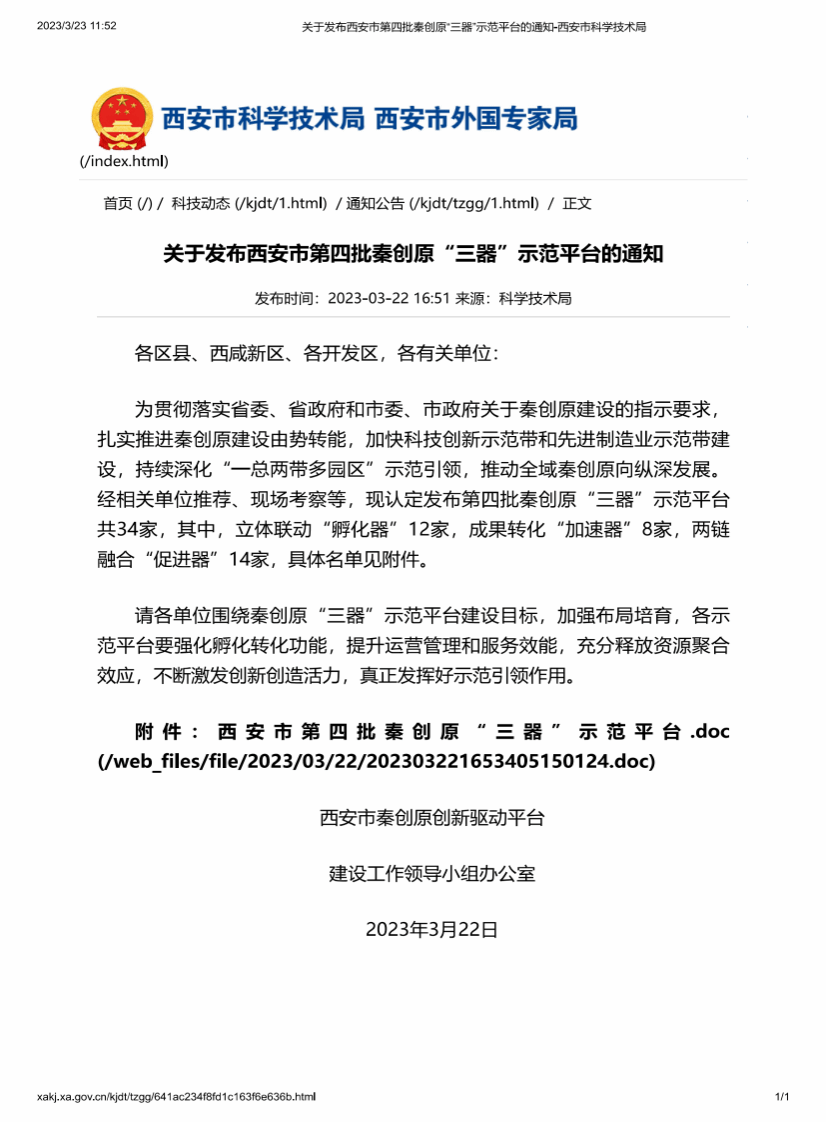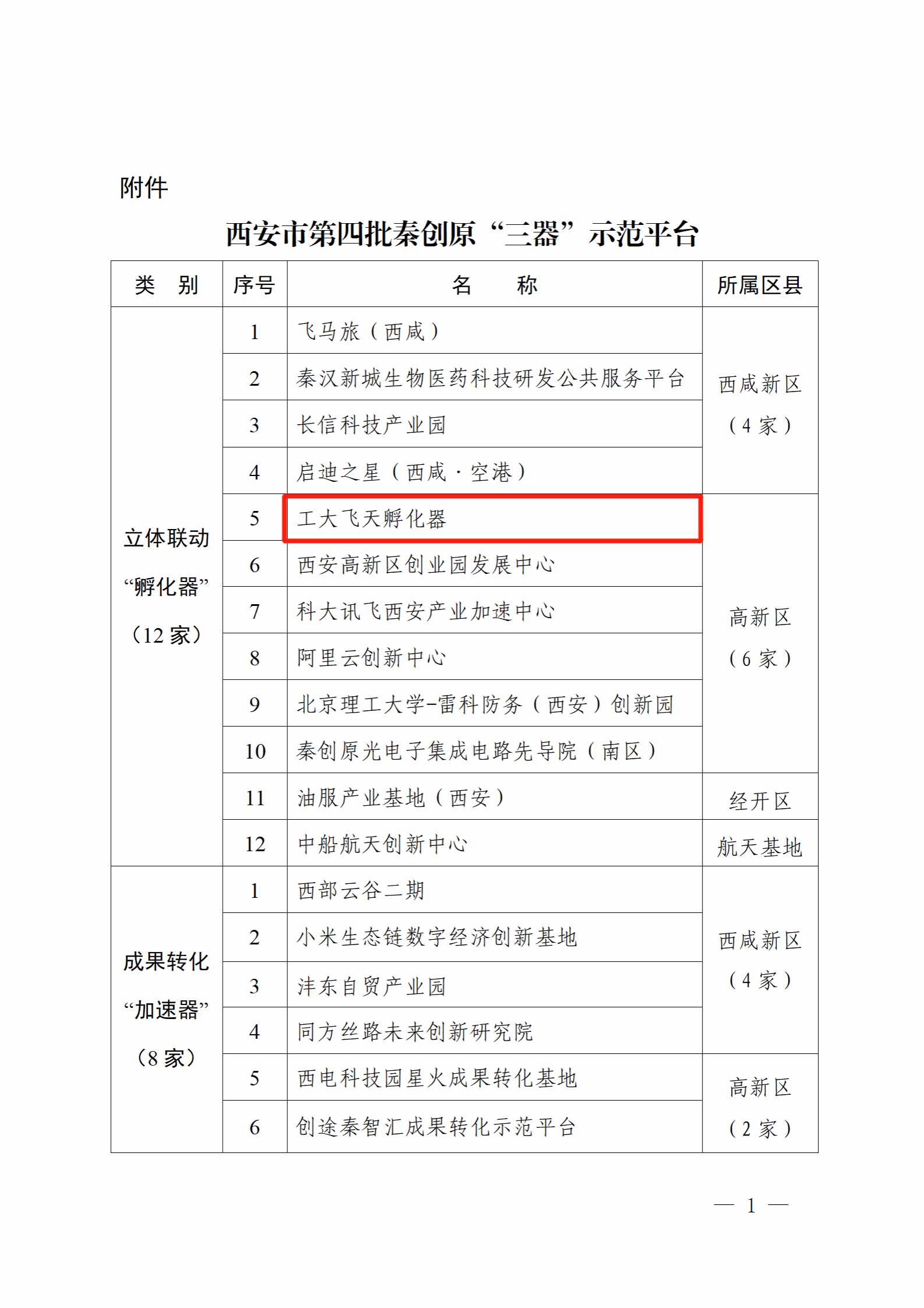 近日,西安市科学技术局发布了第四批西安市秦创原“三器”示范平台名单,西工大科技园工大飞天孵化器成功入选立体联动“孵化器”。