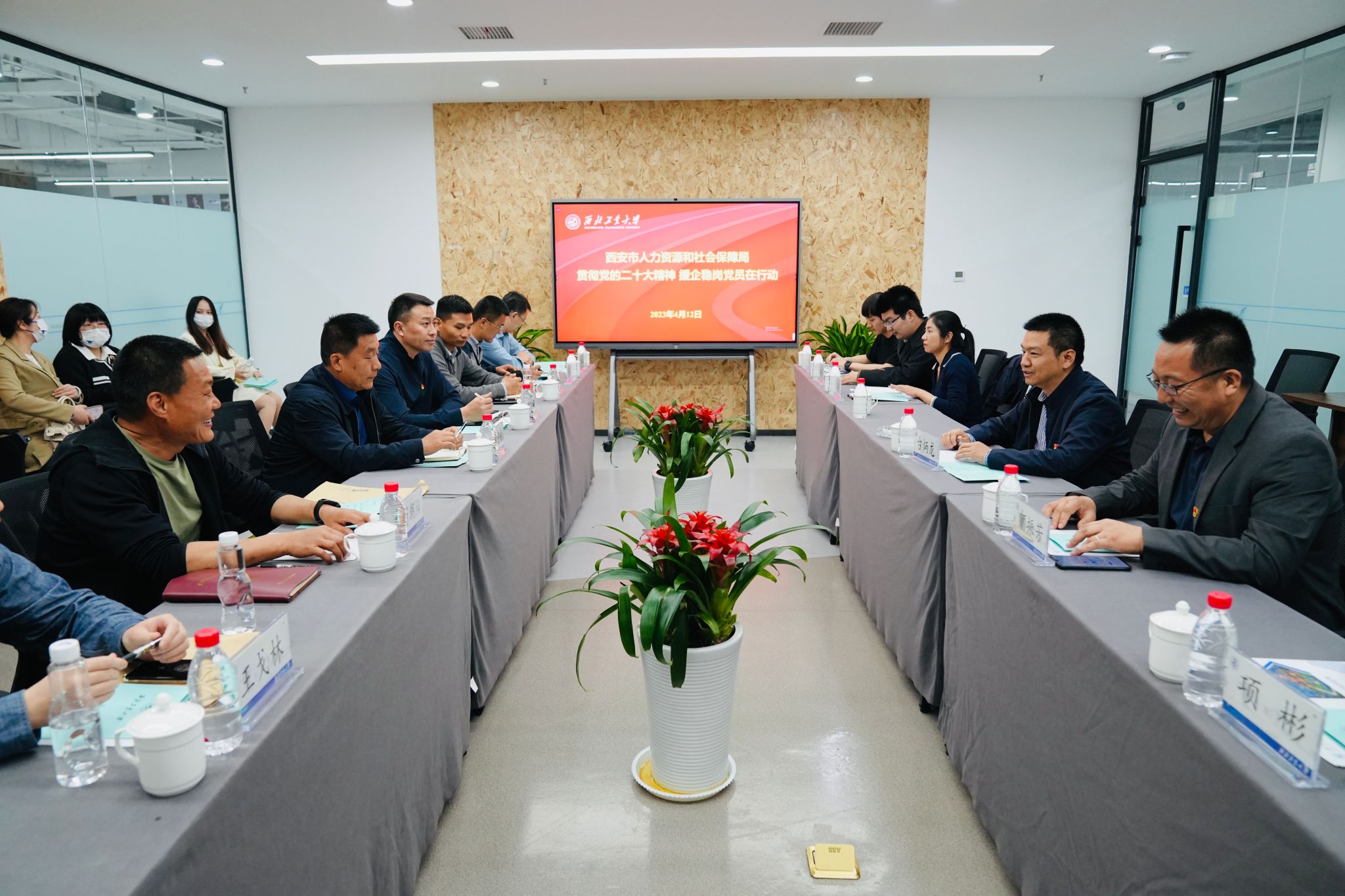 4月12日下午,西安市人力资源与社会保障局就业处党支部书记、处长廉宏彬携农工处、就业指导中心党支部等一行10人来校举行主题党日活动,并调研创业孵化带动就业相关工作,资产公司总经理、国家大学科技园主任符新伟,资产公司副总经理台炳龙等参加调研。