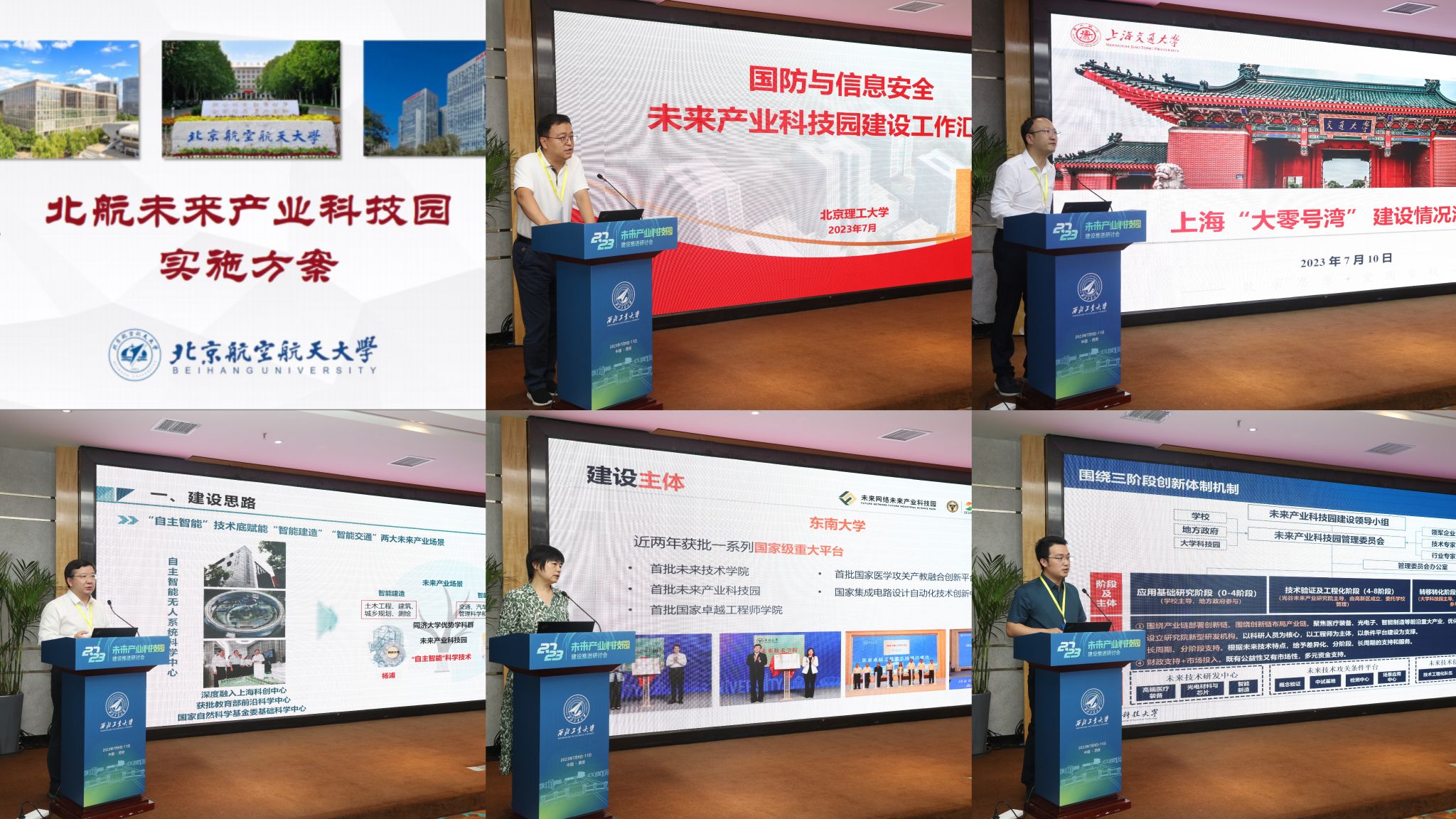 朱星华主持工作交流环节。来自北京航空航天大学、北京理工大学、上海交通大学、同济大学、东南大学、华中科技大学、中山大学、西南交通大学、西北工业大学、哈尔滨工业大学和合肥高新区等单位的领导,分别代表十所未来产业科技园建设试点单位和一个建设试点培育单位逐一就获批建设试点以来的工作进展情况、存在的困难与建议以及下一步举措等方面进行了介绍和交流。